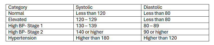 Below is the general table followed worldwide. It is as per the American Heart Association and other health organizations, for a general adult;